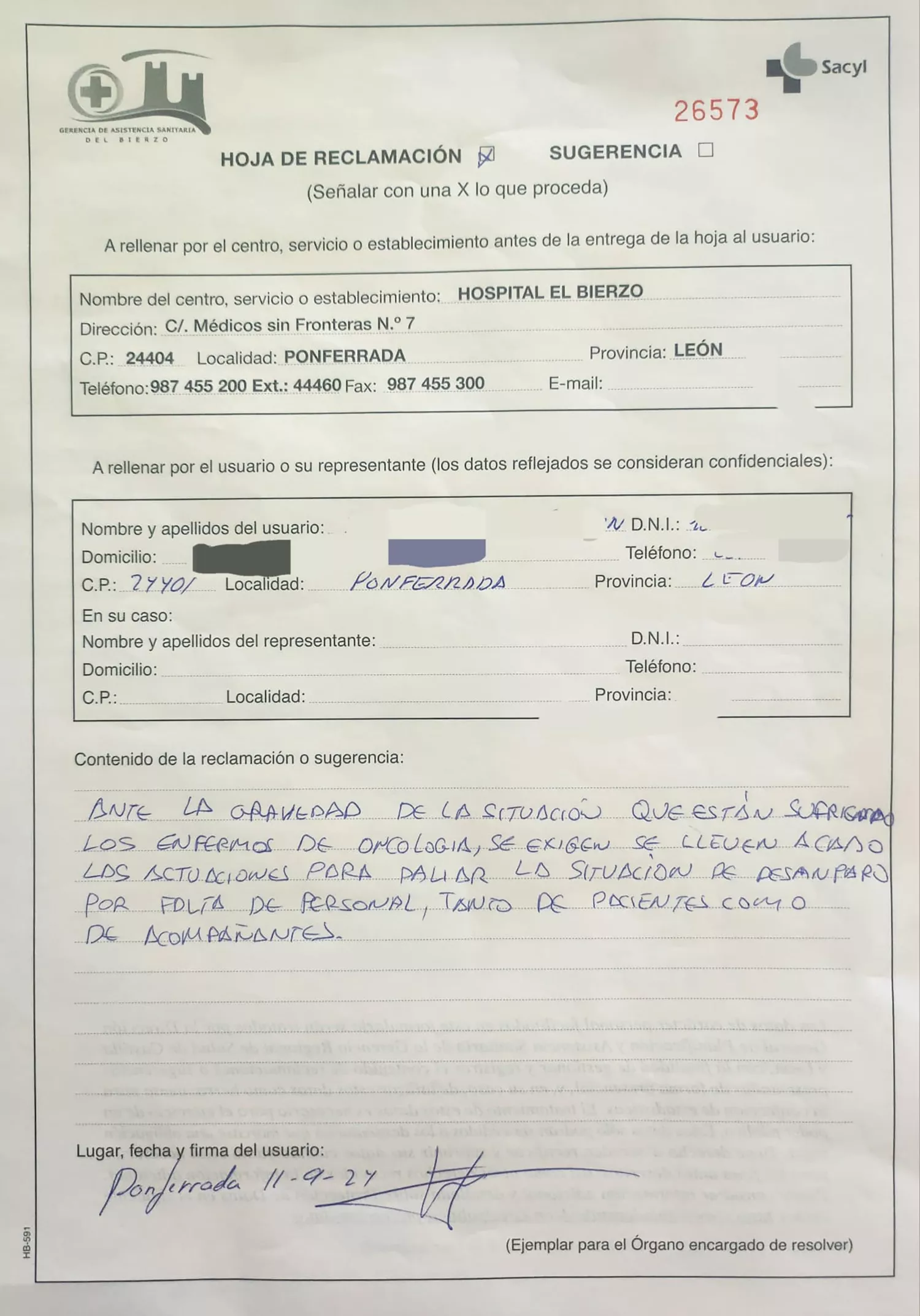 La Asociación El Defensor del Paciente remitía, hace unos días, la solicitud a la Fiscalía Provincial de León para llevar a cabo una investigación ante las carencias que sufre el servicio de Oncología en el Hospital del Bierzo.
