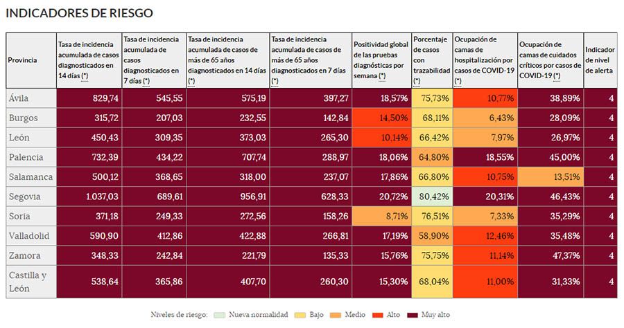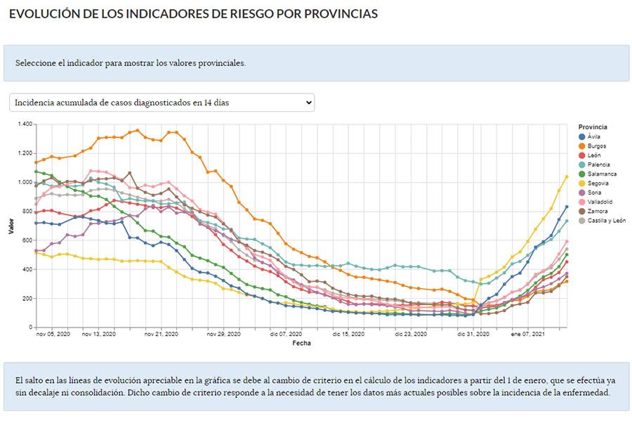 Cabe destacar que la Junta de Castilla y León especifica en su portal de datos que "de acuerdo con lo que indica el documento 'Actuaciones de respuesta coordinada para el control de la transmisión de COVID-19' acordado por el Consejo Interterritorial del Sistema Nacional de Salud, los niveles de riesgo correspondientes a municipios o territorios pequeños, especialmente los de menos de 5.000 habitantes, debe ser valorados de forma muy local y teniendo en cuenta el contexto y la situación de cada lugar. Por este motivo, aunque aparecen coloreados todos los municipios según el nivel de riesgo que está descrito en este apartado, no se indicará el valor numérico en municipios de menos de 1.000 habitantes".