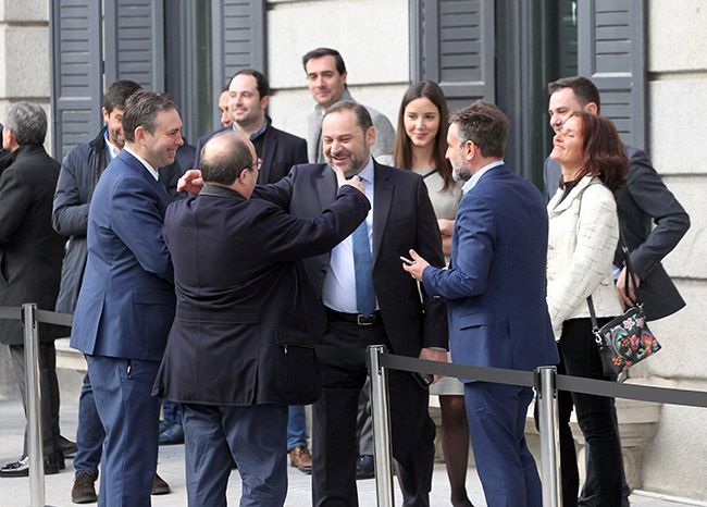 El secretario del partido socialista en Cataluña, Miquel Iceta, abraza al ministro en funciones de Fomento, José Luis Ábalos