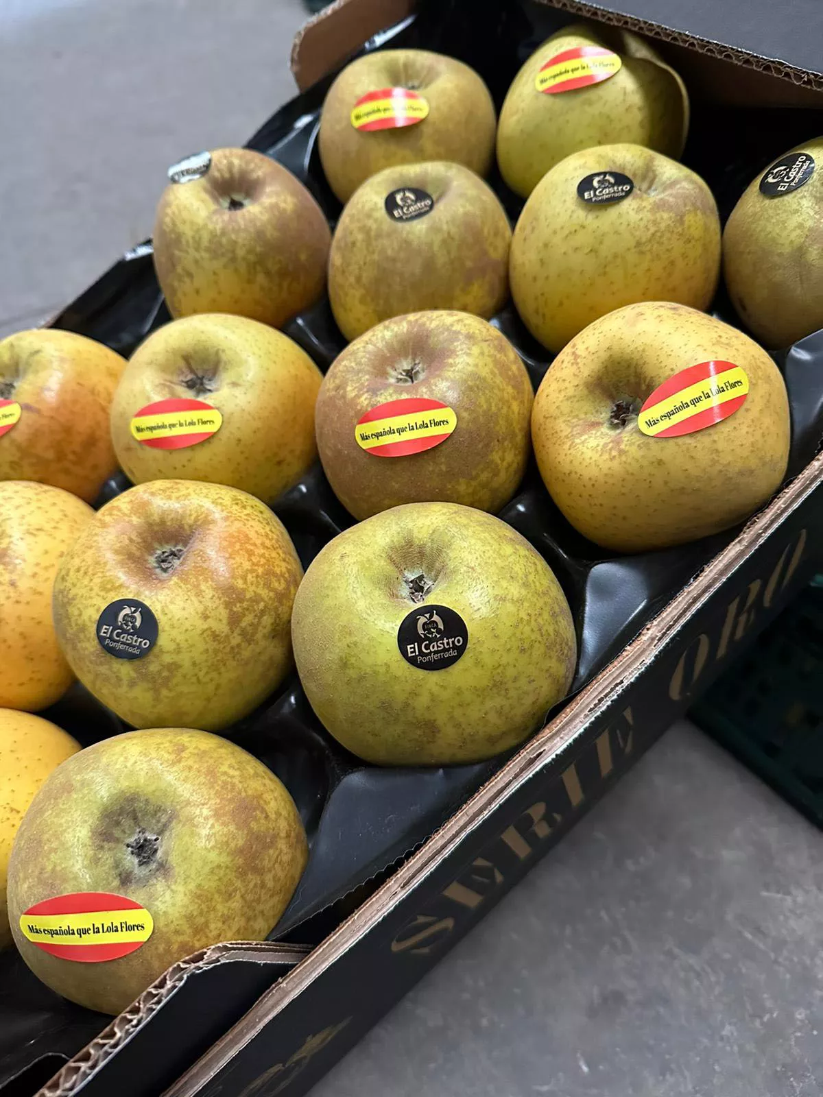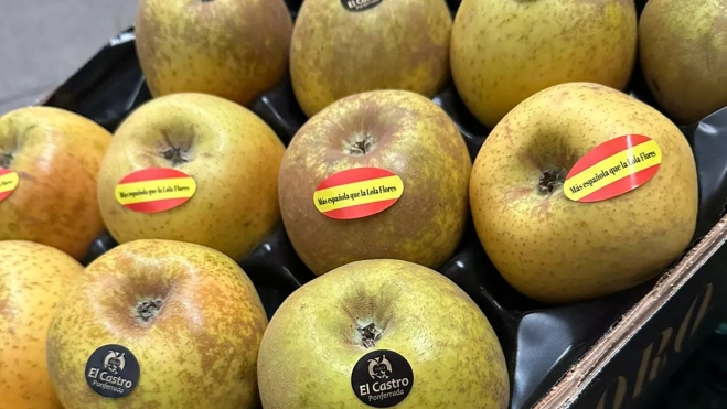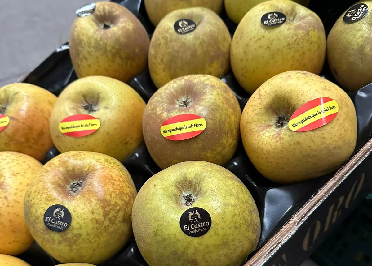 Finca El Castro es una empresa dedicada a la producción propia de manzana y pera de diferentes variedades en El Bierzo desde hace 25 años, aunque en los últimos 12 se centran en la distribución del producto. En su apuesta por lo local y su reivindicación y defensa de la Comarca, esta empresa ha encargado 350.000 pegatinas con la bandera de España y la frase 'Más españoles que la Lola Flores' superpuesta, para que, con humor, no quede ninguna duda de la procedencia del género.