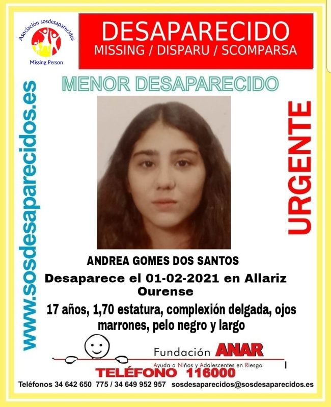 Andrea Gomes Dos Santos, de 17 años, desapareció en la localidad gallega el pasado lunes 1 de febrero. Mide 1.70, es de complexión delgada, ojos marrones, pelo negro y largo.