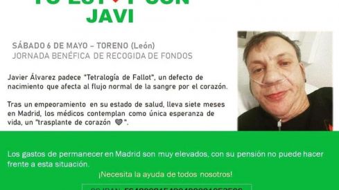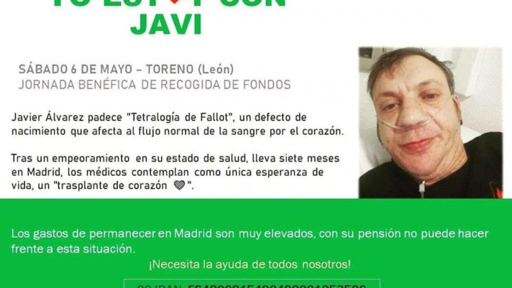 "El berciano Javier Álvarez, padece 'Tetralogía de Fallot', un defecto de nacimiento que afecta al flujo normal de la sangre por el corazón", este es el mensaje publicado en un cartel, a través de las redes sociales, en el que se pide colaboración a todo aquel que se quiera sumar para ayudar a este berciano mientras espera un trasplante de corazón. De esta manera, se solicita ayuda y solidaridad para cubrir los gastos de permanecer en Madrid ya que "son muy elevados y con su pensión no puede hacer frente a esta situación". "Tras un empeoramiento en su estado de salud, lleva siete meses en Madrid, los médicos contemplan como única esperanza de vida un trasplante de corazón" según explican en el mensaje.