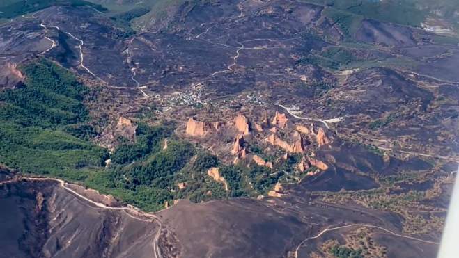 El piloto e instructor de vuelo leonés Diego Rodríguez, conocido en redes sociales como Flydirop, ha captado desde el aire las sobrecogedoras imágenes que muestran la magnitud del incendio que hace un mes arrasó el entorno de Las Médulas, Patrimonio de la Humanidad.