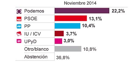 Pese a ser una formación relativamente nueva, el partido liderado por Pablo Iglesias ya consiguió unos muy buenos resultados en las elecciones europeas, celebradas el pasado mes de mayo, donde logró cinco escaños en Estrasburgo. Y de confirmarse las predicciones de este sondeo se cambiaría completamente el actual panorama político, marcado por el bipartidismo de PP y PSOE.