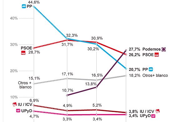 Podemos, por su parte, se conviertiría en la formación que conseguirá esa fragmentación ideológica al atraer el interés de los indignados, al movilizar a nuevos votantes y anteriores abstencionistas, unos votantes a los que, al parecer, no consiguen llegar ni UPyD ni IU.