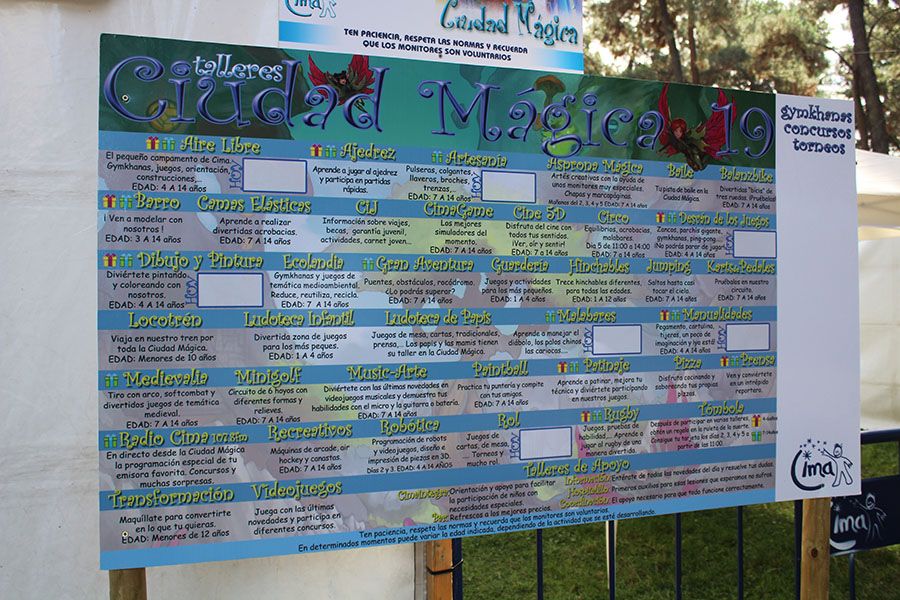 CIMA contará en esta edición con 40 talleres entre los que se encuentran Ajedrez, Baile, Camas elásticas, Ludoteca de papis, Guardería, Tómbola,Videojuegos o multitud de hinchables. A todos ellos se suman los talleres de apoyo Información, Cima Integra, Hospitalillo, Bar y Coordinación. A continuación puedes consultar el PROGRAMA COMPLETO DE ACTIVIDADES.