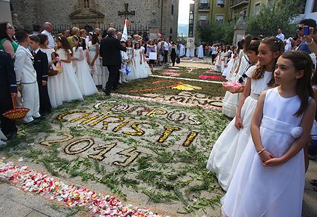 Los niños que han hecho la comunión procesionaron por esta alfombra, en una celebración en la que también participaron las autoridades locales, con el regidor, Samuel Folgueral, a la cabeza.
