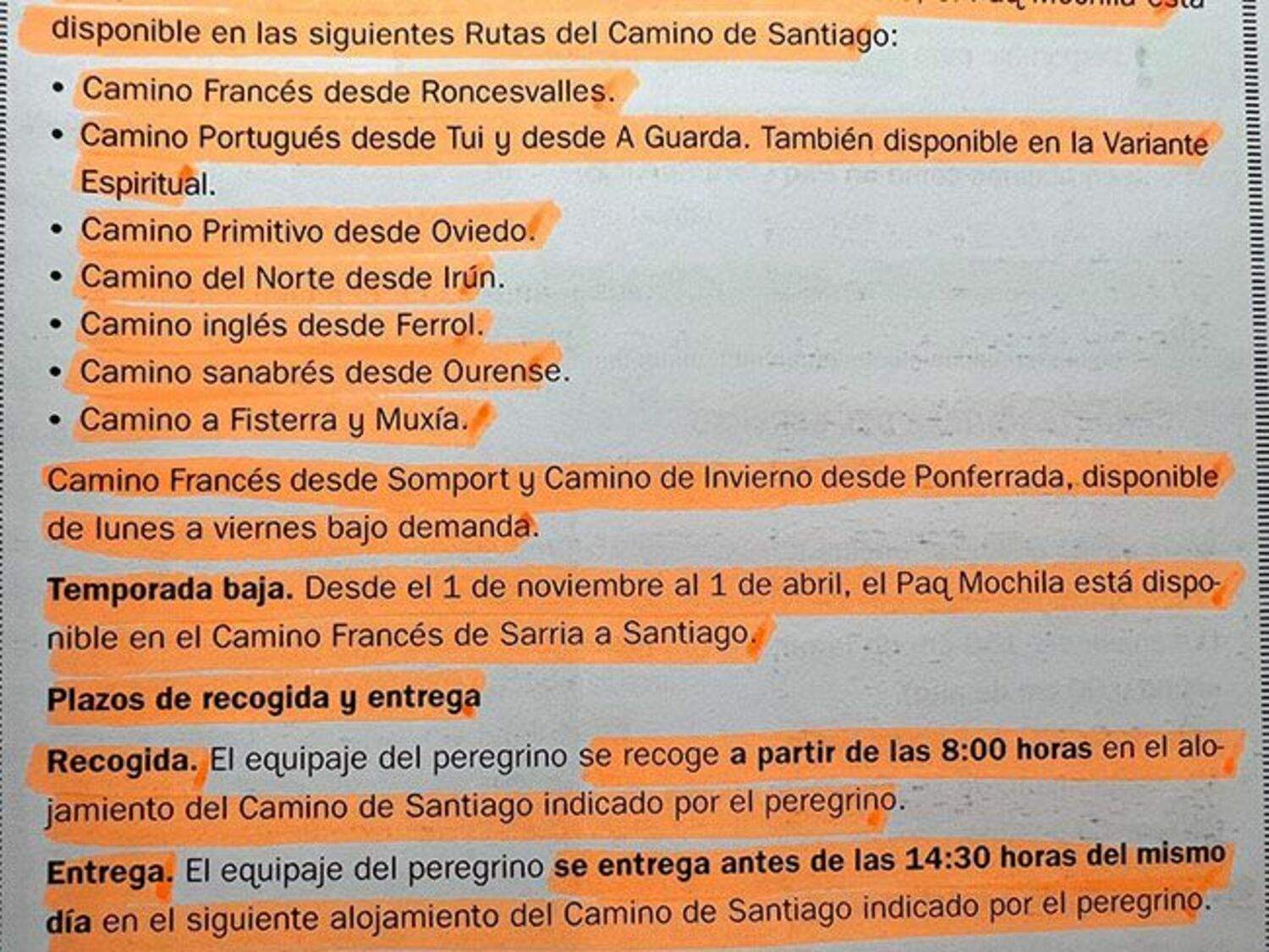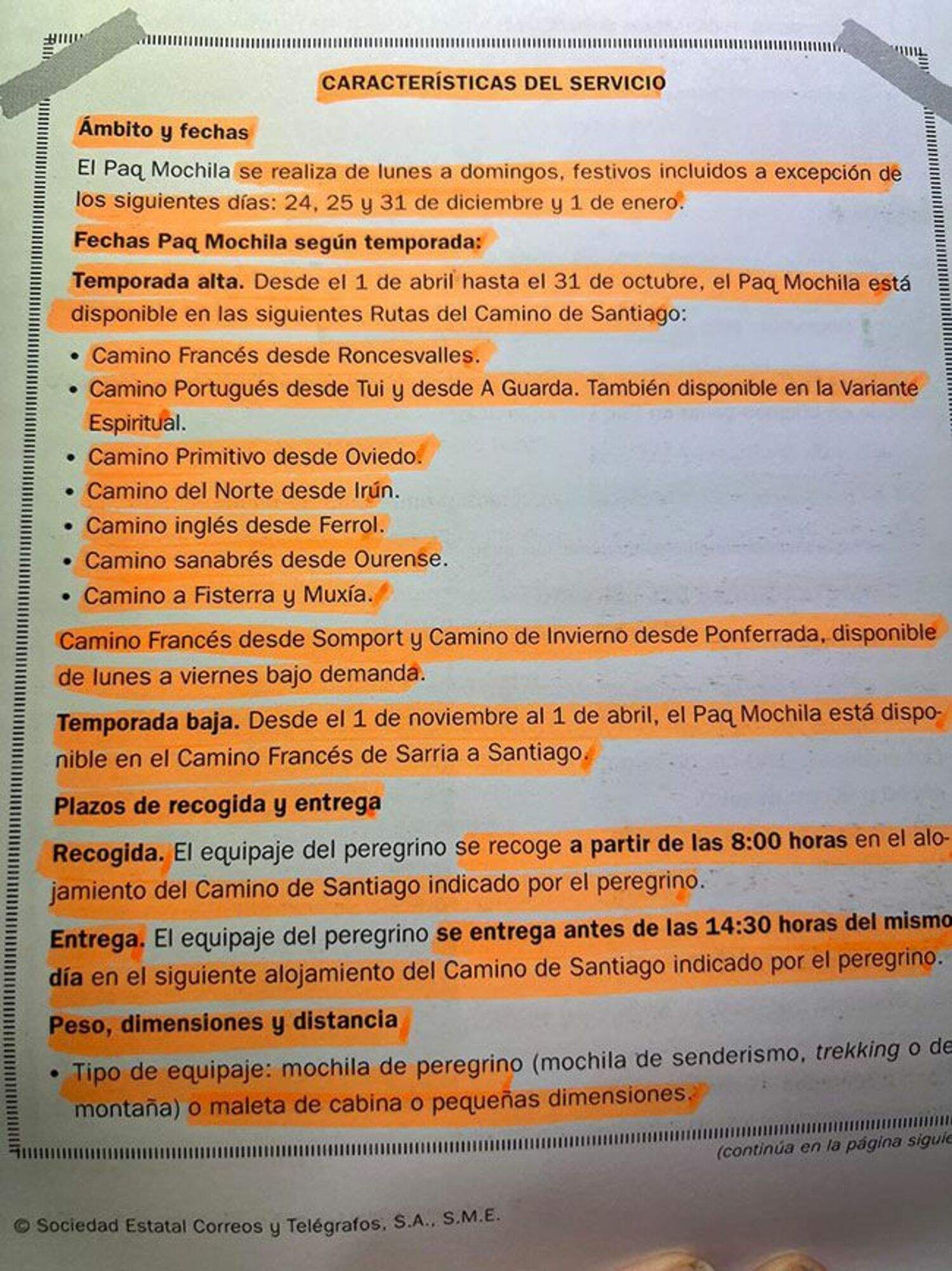 El Camino Francés, el de Invierno -desde Ponferrada-, el Primitivo, etc. aparecen reflejados en el temario de oposición a lado de información sobre el peso, el precio, los horarios y otros asuntos de importancia para el examen y para el correcto funcionamiento del servicio que Correos presta a los peregrinos.