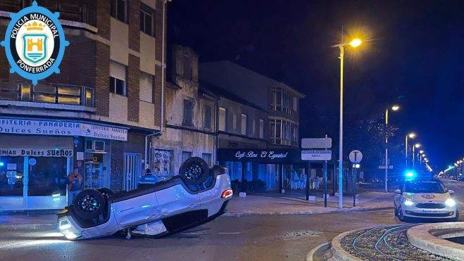 La Policía de Ponferrada ha intervenido esta madrugada en un accidente de circulación en el que un vehículo ha chocado frontalmente contra la glorieta de Cuatrovientos quedando volcado ante la rotonda.