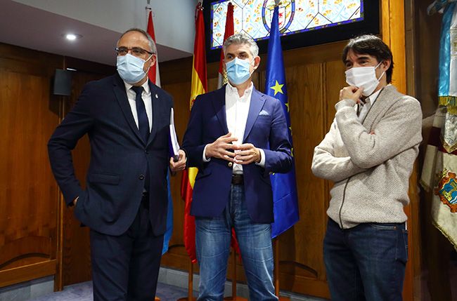 César Sánchez / ICAL . El alcalde de Ponferrada, Olegario Ramón (I), junto al director del centro asociado de la Uned, Jorge Vega (C), y el director técnico de la empresa Redytel, Óscar Cela (D), durante la presentación del proyecto de medición de la calidad del aire en los edificios públicos de la ciudadPonferrada presentó este miércoles un proyecto pionero a nivel mundial de medición de la calidad del aire en edificios públicos. Se trata de un sistema que pretende convertirse en una solución innovadora para medir en tiempo real la calidad del aire que tiene un sistema de alarma que avisa a través de una app que hay que tomar medidas. Así lo ha explicado el alcalde de Ponferrada, Olegario Ramón, quién resaltó que "puede tener relación con determinadas situaciones en la lucha contra la pandemia del COVID-19".