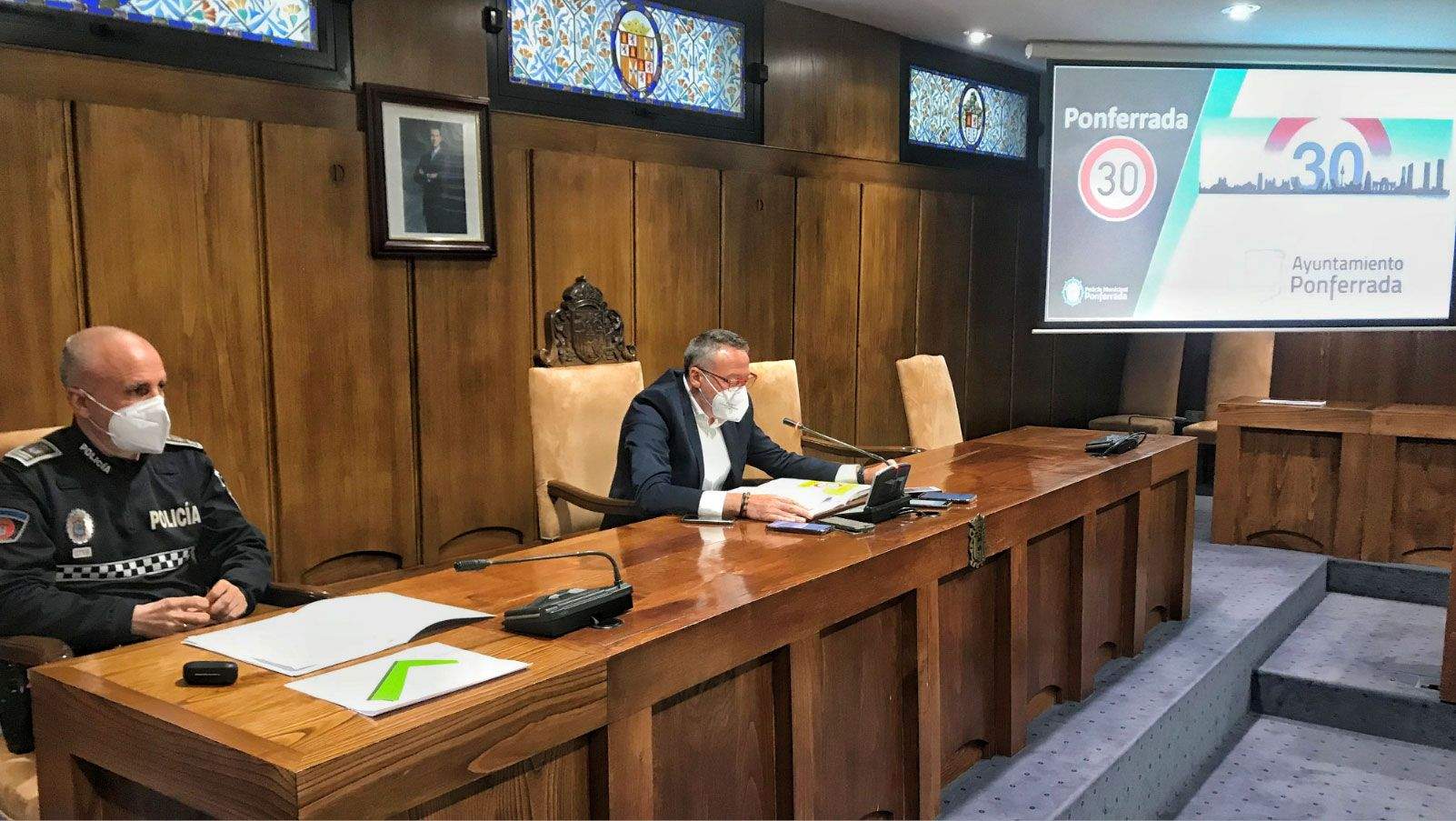 Foto: José Antonio Cartón, concejal de Seguridad ciudadana, Personas y Movilidad junto con el Intendente Jefe de la Policía Municipal en la presentación de la nuevas zonas de Ponferrada a 30kmk/h / Luis BoyaSANCIONES