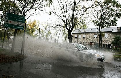 Imagen del paso de coches por el barrio de Compostilla este lunes / César SánchezSegún los datos de la estación meteorológica Meteo Spyfly en Ponferrada, a lo largo del día, entre las 0h. y las 21h. se han recogido 48 l/m2. En este tramo ha llovido durante todas las horas del día.