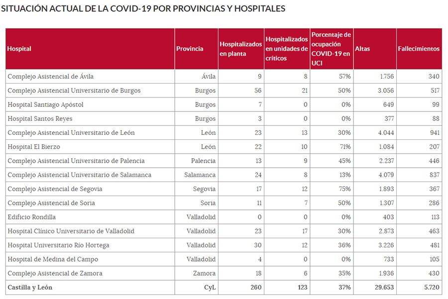 Finalmente, el Hospital El Bierzo concedió en el último día dos altas a pacientes COVID, hasta el total de 1.084 desde el inicio de la pandemia. Además, certifica una jornada más sin fallecimientos (207 en total) y tampoco ha sumado nuevos ingresos. Con todo, a fecha de 12 de mayo hay 32 personas hospitalizadas por coronavirus en el complejo hospitalario berciano, de las cuales 22 se encuentran en planta y 10 en la Unidad de Cuidados Intensivos (UCI), al 71% de su capacidad.