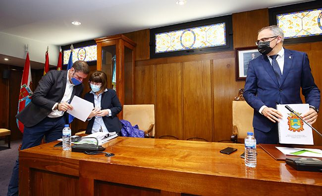 El alcalde de Ponferrada, Olegario Ramón (D), junto al portavoz del grupo de Coalición por el Bierzo, Iván Alonso (D), y la concejala de Hacienda, Mabel Fernández, durante el pleno de presupuestos en el Ayuntamiento de Ponferrada (Foto: César Sánchez / ICAL)