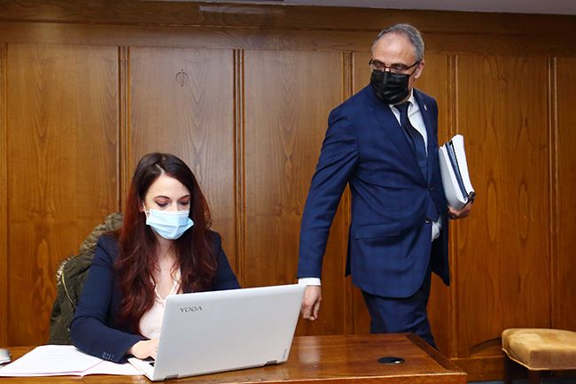 El alcalde de Ponferrada, Olegario Ramón, junto a la portavoz Unidas Podemos, Lorena González, durante el pleno de presupuestos en el Ayuntamiento de Ponferrada (Foto: César Sánchez / ICAL)