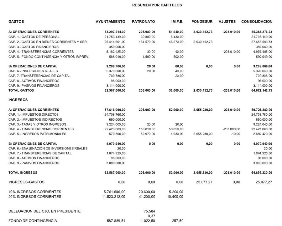 El presupuesto general del Ayuntamiento de Ponferrada para el ejercicio de 2021 asciende a 62.587.000 millones en ingresos y gastos; 206.000 para el Patronato de Fiestas en ingresos y gastos; 52.000 euros para la disolución del Instituto Municipal de Formación y Empleo (I.M.F.E.); 2.030.152,73 euros para la Sociedad Pongesur en trámite de disolución; que en definitiva arrojan una cifra de 64.672.142,73 euros de presupuesto consolidado y un superávit de 25.077,27 euros. Para sacar adelante los presupuestos el consistorio ha recurrido a un préstamo de 3 millones de euros, que el alcalde introdujo como "un momento de extraordinaria complejidad para el aumento de las inversiones".