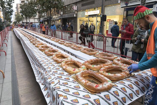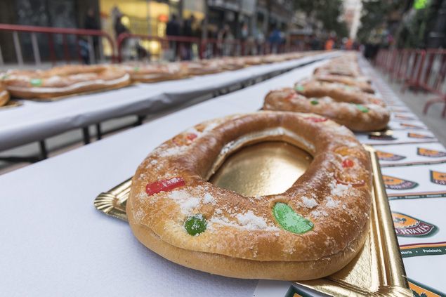 Y esta vez el Roscón de Reyes estaba relleno de... premios. No se trataba de uno cualquiera. Más de 100 piezas sumaron 180 kilos de dulce en una hilera de más de 55 metros de largo para presumir de ser el 'más grande del mundo'. La Asociación de Comercio Urbano Templarium lo rellenó de hasta 5.000 euros repartidos en cheques (80 cheques por valor de 25 euros, 40 por valor de 50 euros, 3 por valor de 200 euros y cuatro por valor de 100 euros) para gastar entre los días 4 y 5 de enero en sus comercios adscritos. La actividad generó una gran expectación de público, que formó largas colas.