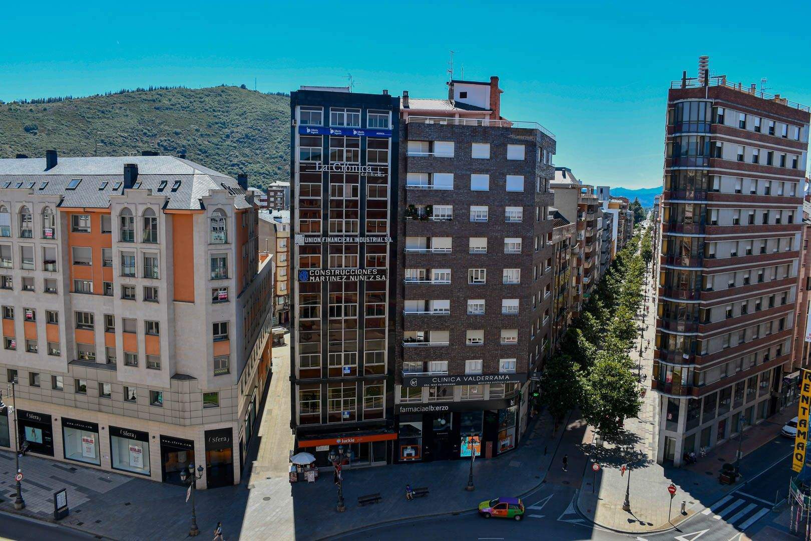 Así son las vistas desde uno de los edificios más emblemáticos de Ponferrada, construido en plena 'ciudad del dólar' de los años 50, incluso años antes de que se pusieran en marcha las obras del también mítico edificio Uría que se situaría justo en frente. Cara a cara los dos edificios, testigos del pasado de oro de la capital berciana, son separados únicamente por la Plaza Julio Lazurtegui, 'corazón' de la ciudad.