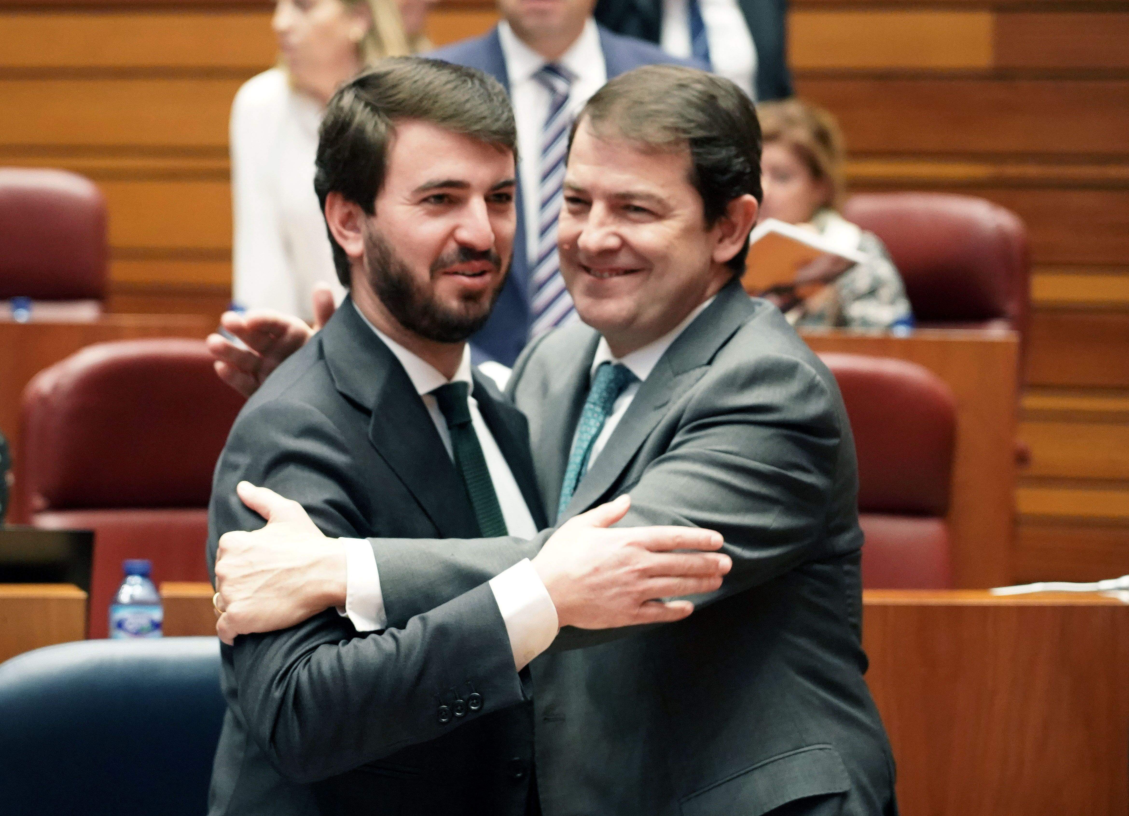 El presidente de la Junta, Alfonso Fernández Mañueco, y el vicepresidente, Juan García Gallardo, aplauden tras ser aprobados los Presupuestos de la Comunidad para 2023