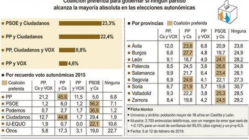 La coalición de PSOE y Ciudadanos es la preferida por los castellanos y leoneses para gobernar la Junta de Castilla y León si en las elecciones del 26 de mayo ningún partido alcanza la mayoría absoluta. Un 23,3 por ciento de los ciudadanos apuesta por esta alianza frente a un 22,4 por ciento que prefería que se forjara un pacto entre el Partido Popular y la formación ‘naranja’.