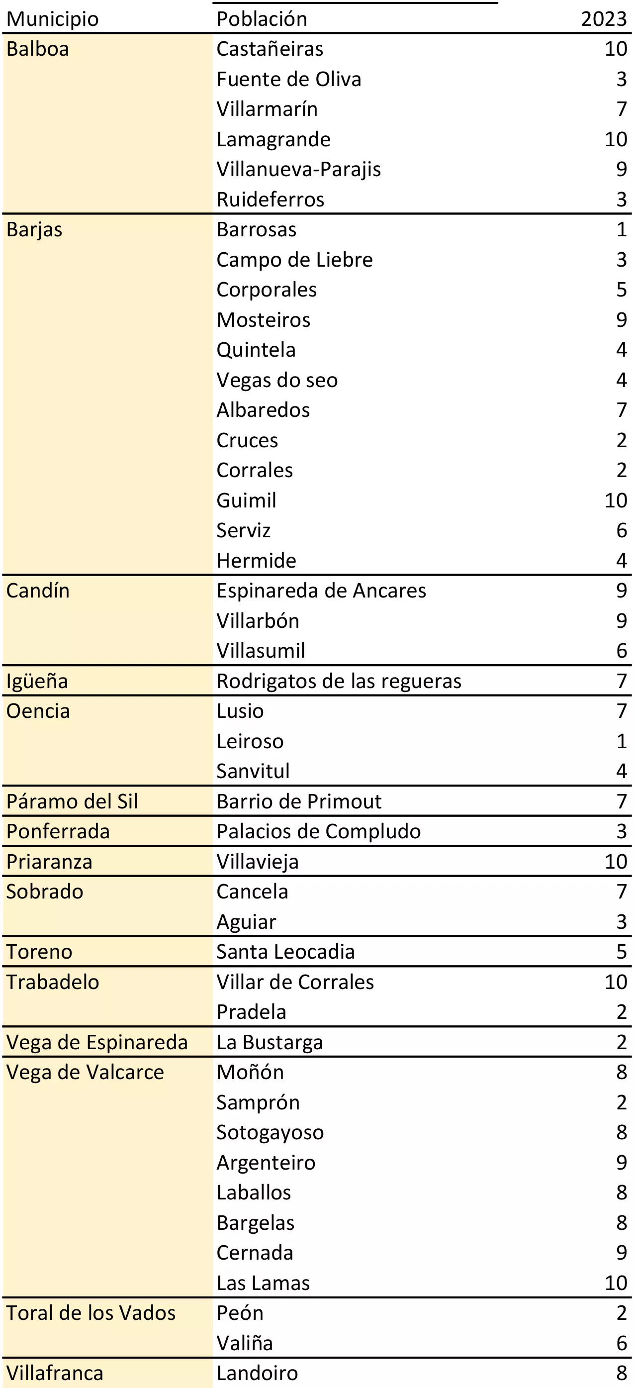 Son dos las localidades con tan sólo una persona, como es el caso de Barrosas (Barjas) y Leiroso (Oencia), ambas repiten 'top' del año pasado.