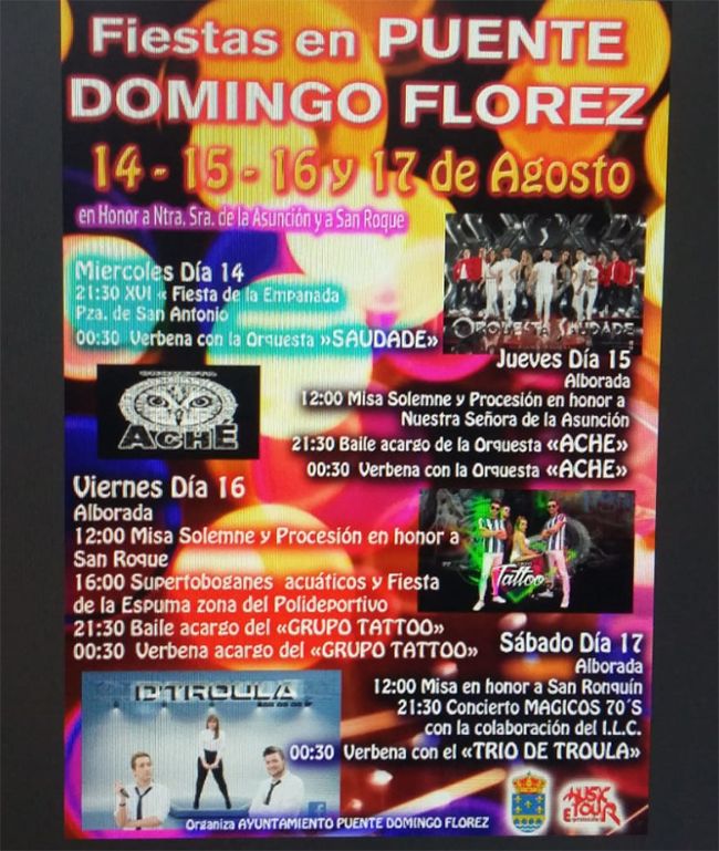 El municipio berciano de Puente de Domingo Florez celebrará sus fiestas del 14 al 17 de agosto en honor a la Virgen de la Asunción y a San Roque. Entre los actos programados, destaca la XVI edición de la tradicional Fiesta de la Empanada (miércoles a las 21.30h en la plaza de San Antonio); los supertoboganes acuáticos y fiesta de la espuma (viernes a las 16.00h en la zona del polideportivo) y el concierto Magicos 70's el sábado 17 a las 21.30 horas.