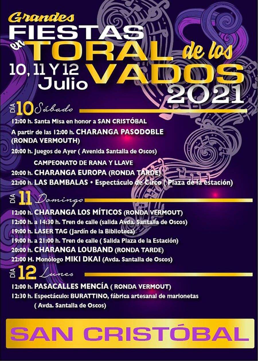 Los días 10, 11 y 12 de julio tendrán lugar en Toral de los Vados las fiestas patronales en honor a San Cristóbal. Debido a la situación provocada por la pandemia se pide a los asistentes que guarden todas las medidas higiénico sanitarias y que tomen todas las precauciones posibles para evitar contagios por COVID-19 y se recuerda que en el exterior cuando no sea posible guardar la distancia mínima de seguridad es obligatorio el uso de mascarilla.