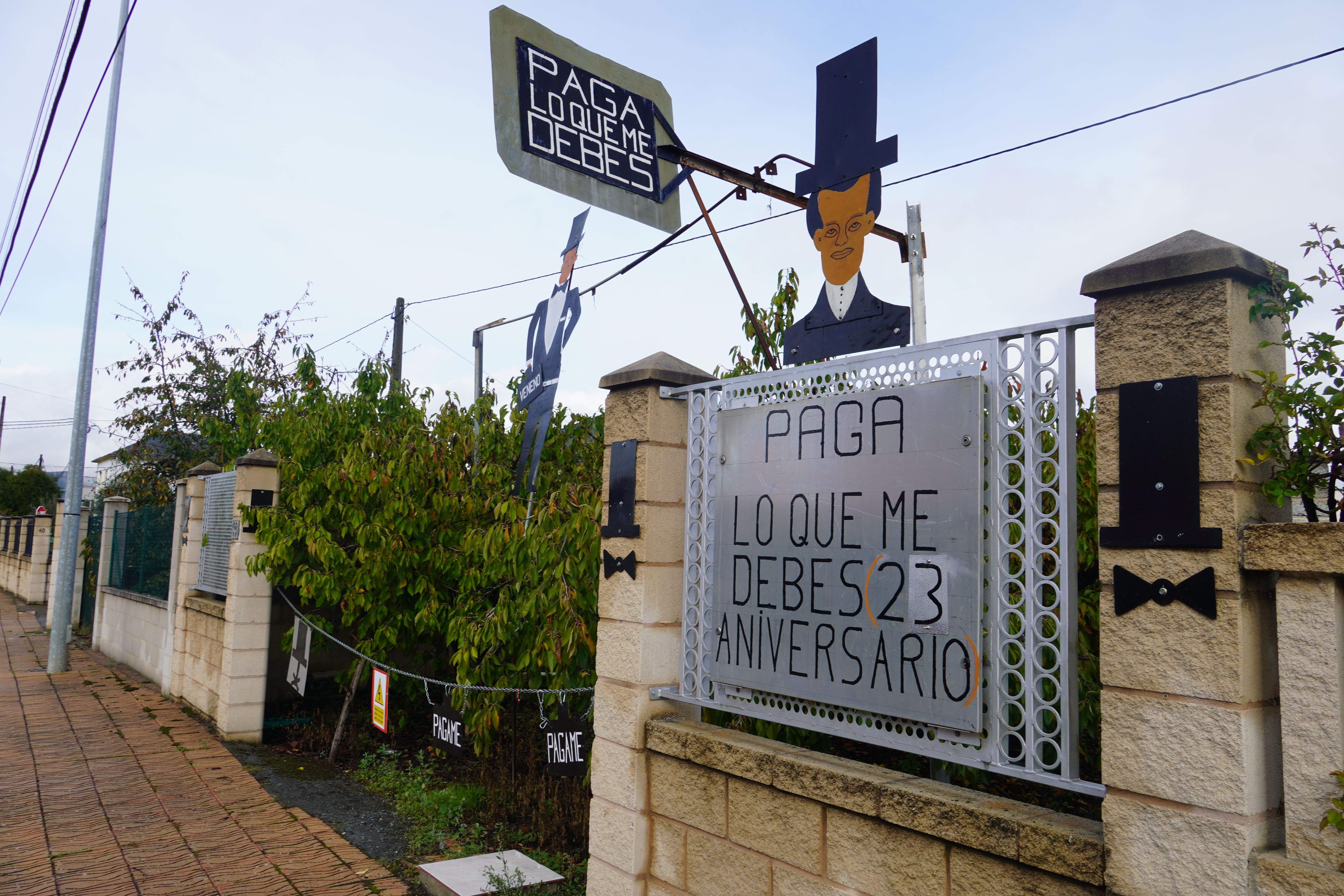 La cuenta sigue sumando años sin que cese en el empeño, y las proclamas se han convertido ya en un clásico en la carretera a Cacabelos LE-713. Muchas son las personas que preguntan si es al propietario de dicha finca a quien se le colocan los carteles para que pague, o es al revés y el dueño del terreno está martilleando con su decoración hacia la vía pública, como es el caso, para 'vocear' su enfado, que pasa de las 2 décadas sin olvidar la cuenta.