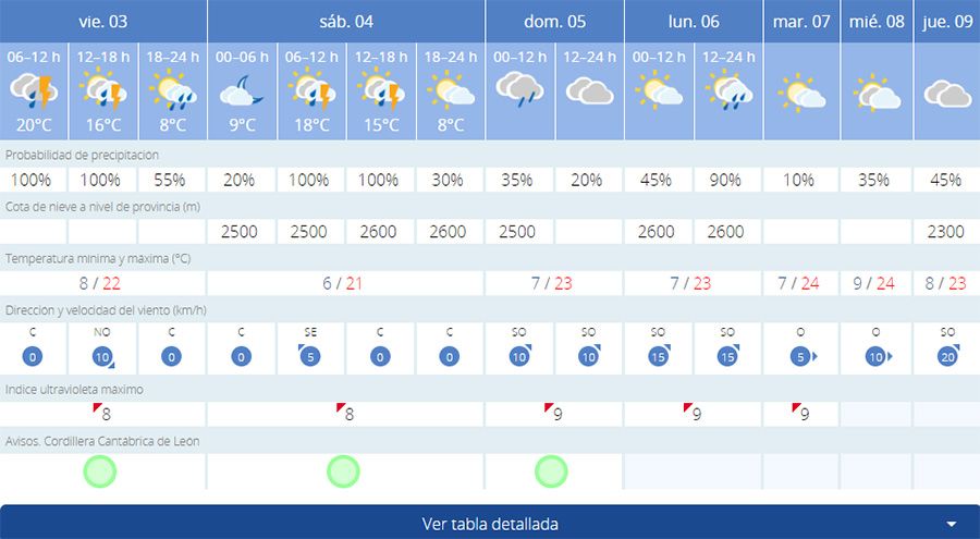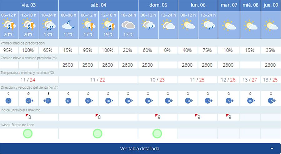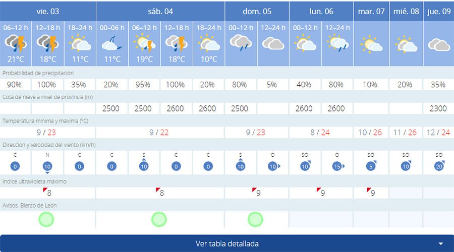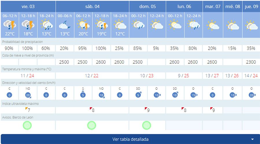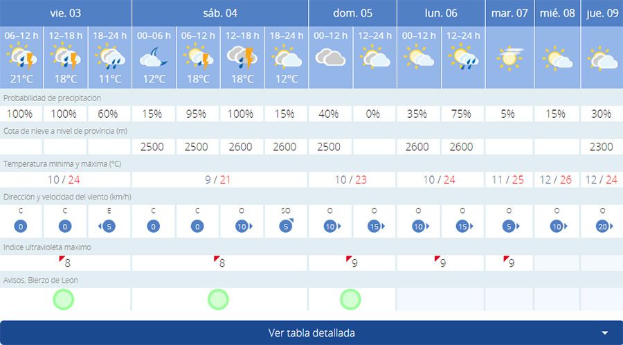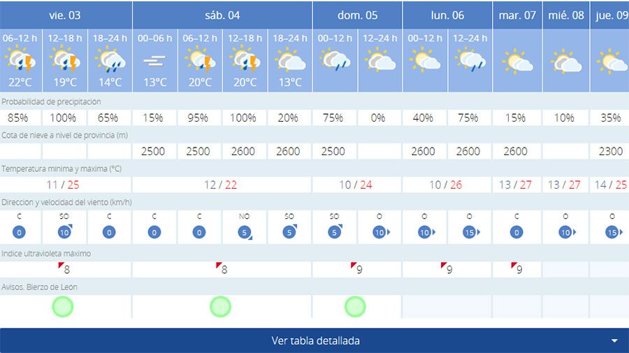 La capital berciana no dejará de ver las nubes en su cielo. La tormenta y los rayos aparecen el fin de semana y las lluvias estarán presentes casi toda la semana, con precipitaciones de hasta el 100%. Las temperaturas mínimas rondarán los 11 grados y las máximas serán de 27.