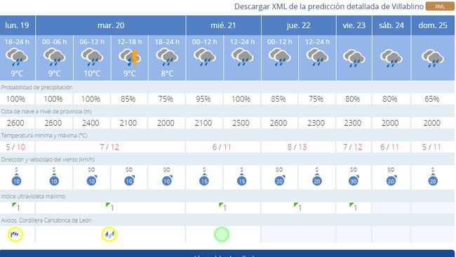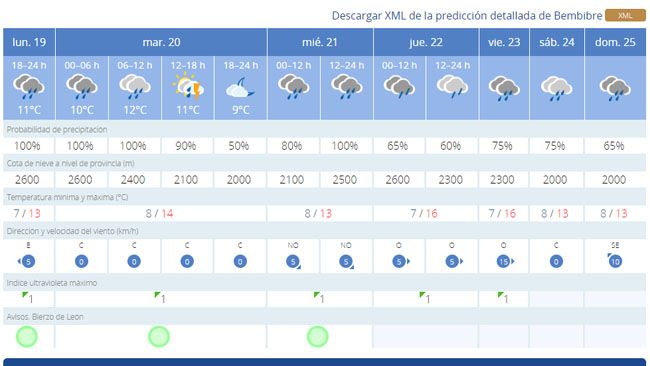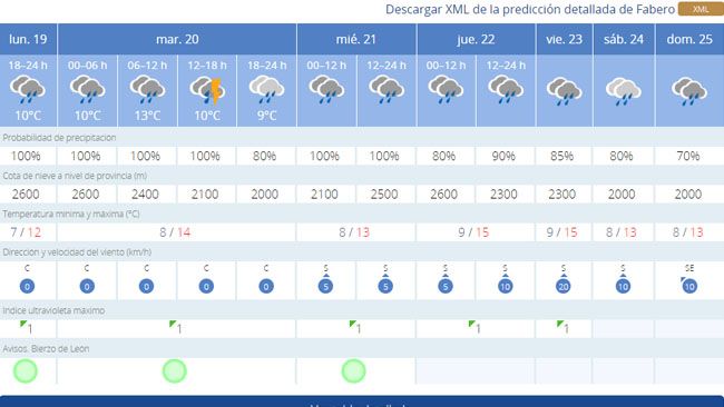 Si miramos hacia Fabero, las previsiones indican temperaturas muy similares a las de la capital de la comarca y del Bierzo Alto. Los cielos se mantendrán cubiertos y nubosos y las temperaturas rondarán entre los 8º y los 13º. Habrá presencia de fuertes precipitaciones, especialmente el sábado 24.