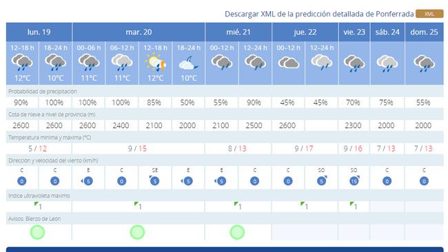 La capital berciana comienza el fin de semana con temperaturas relativamente altas para le época en la que estamos, oscilarán entre los 7º y 13º. Los chubascos y las nubes bajas serán la tónica general de este fin de semana navideño en Ponferrada con una probabilidad del 75% de precipitación el sábado 24. El domingo, tras el día de Nochebuena, la probabilidad de precipitación será algo más baja.