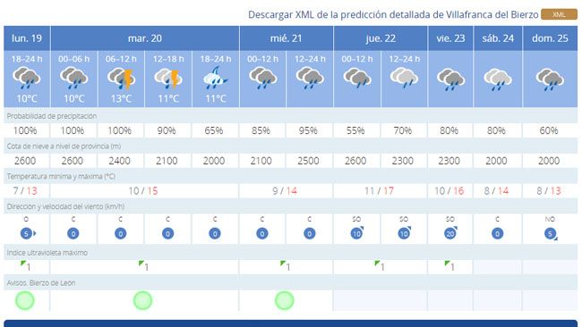 El la zona de Villafranca del Bierzo la situación será similar a la del resto de la comarca con temperaturas mínimas de 8 grados y máximas de 14 para el fin de semana. El día de Nochebuena estará protagonizado por cielos nubosos y una probabilidad del 80% de precipitaciones. La cota de nieve se situará en torno a los 2.000 metros.