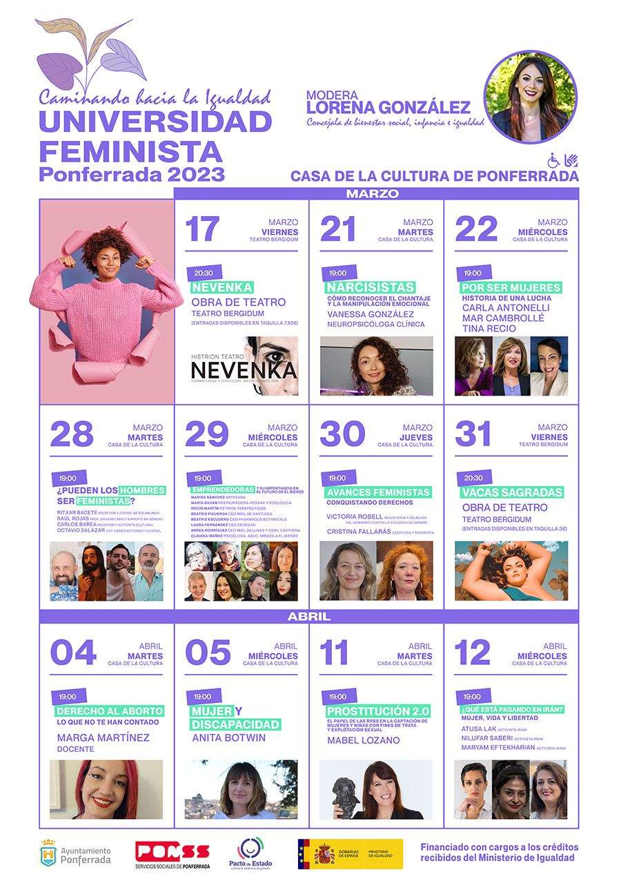 çLa Universidad Feminista Ponferrada 2023 dará comienzo el próximo viernes 17 de marzo con una obra de teatro sobre Nevenka que se representará en el teatro Bérgidum (entradas ya disponibles en taquilla). El martes 21 de marzo contará con la presencia de una neuropsicóloga clínica que cuya ponencia irá encaminada a reconocer e identificar si existe violencia psicológica, chantaje emocional o manipulación en nuestra relación de pareja.