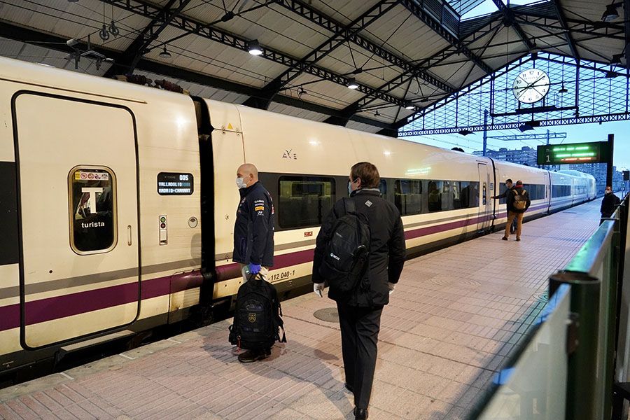 La Policía Nacional entrega mascarillas a los pasajeros del Ave / ICALRenfe pone a partir de este martes a la venta más oferta de trenes, de forma que Castilla y León aumentará su oferta con un nuevo servicio AVE entre León y Madrid y un tren Alvia los fines de semana entre Salamanca y Madrid, así con uno nuevo entre Santander y Madrid.