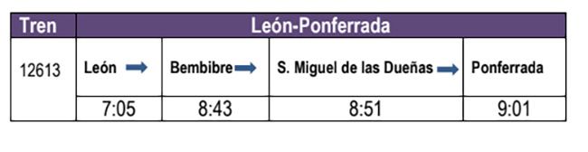 Renfe va a prestar un servicio alternativo de transporte por carretera entre las estaciones de Bembibre, San Miguel de las Dueñas y Ponferrada debido a obras en la infraestructura planificadas por Adif. El único tren que se verá afectado por esta situación es el Media Distancia 12613, que hace a diario el recorrido entre León y Ponferrada a primera hora de la mañana. El viaje se realizará en el tren hasta la estación de Bembibre, donde se iniciará el transporte alternativo por carretera que dará servicio a los viajeros que suban o bajen entre las estaciones de Bembibre, San Miguel de las Dueñas y Ponferrada.