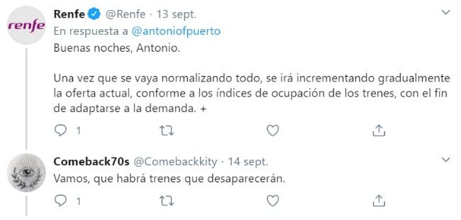 Tras el estado de alarma, Renfe informó de que los trayectos suspendidos por la pandemia se irían reincorporando dependiendo de la demanda y ocupación de los mismos. Sin embargo, otro usuario de esta red social les reprocha que "habrá trenes que desaparecerán". A lo que Renfe rebate explicando que "una vez que se haya normalizado todo se irá incrementando la oferta actual".