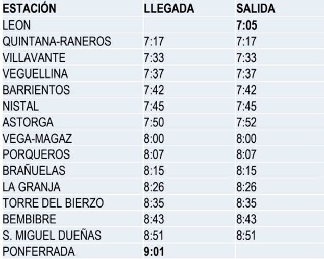 A partir de este jueves, este tren volverá a salir de León a las 7:05 (en vez de las las 6:25) y llegará a Ponferrada a las 9:01 (en lugar de las 8:55).