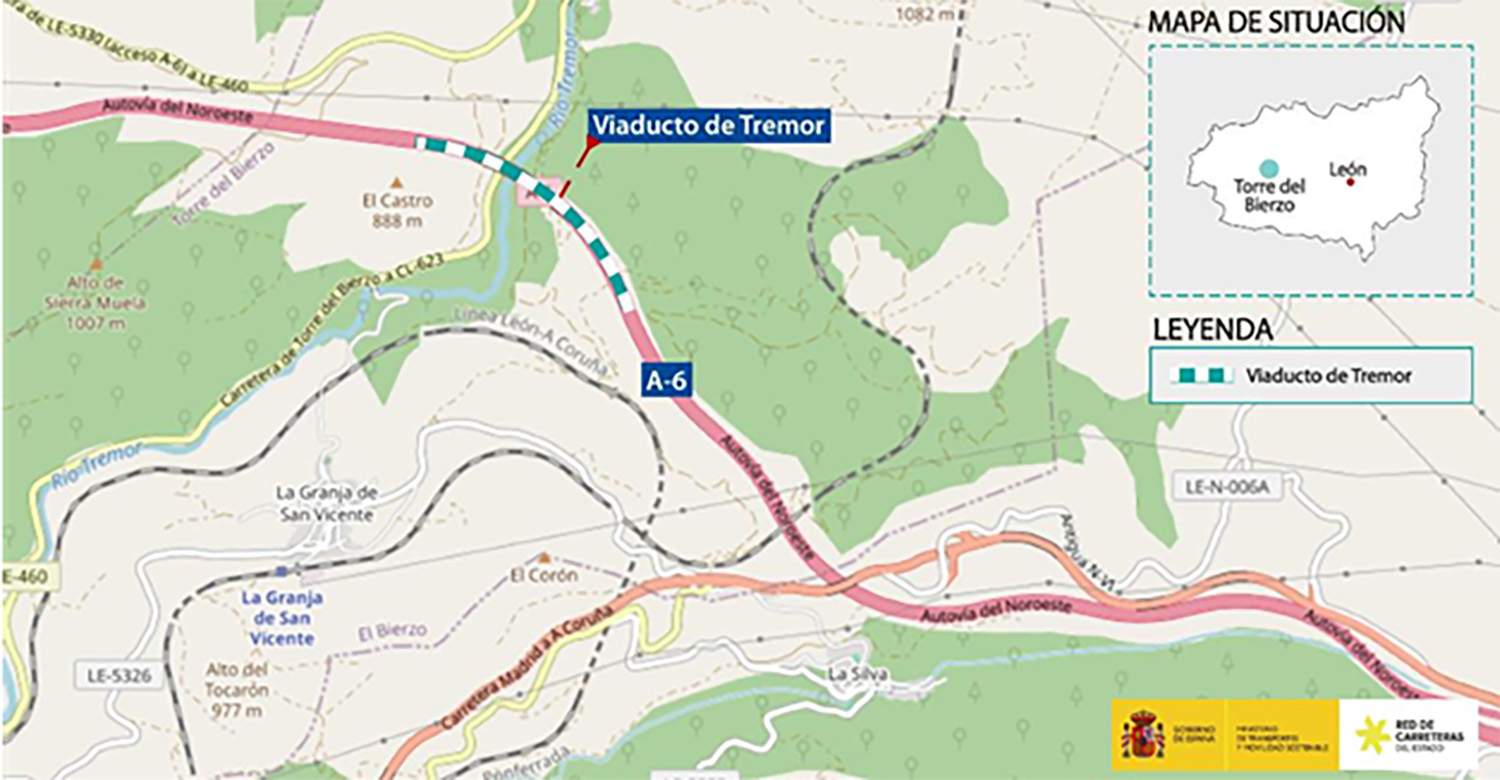 El Ministerio de Transportes y Movilidad Sostenible inicia este lunes, 28 de abril, los trabajos de impermeabilización del tablero de la calzada sentido Madrid del viaducto de Tremor, situado en el km 355,8 de la A-6. Esta actuación forma parte de las labores de conservación y rehabilitación del viaducto, del que ya se impermeabilizó la calzada con sentido A-Coruña.