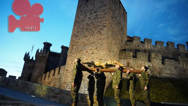 Ponferrada cerró su Domingo de Ramos con la celebración del Traslado al Castillo y Entronización del Cristo de la Esperanza, que corre a cargo de componentes de la USAC (Unidad de Servicios del Acuartelamiento) Santocildes del Ejército de Tierra de Astorga.
