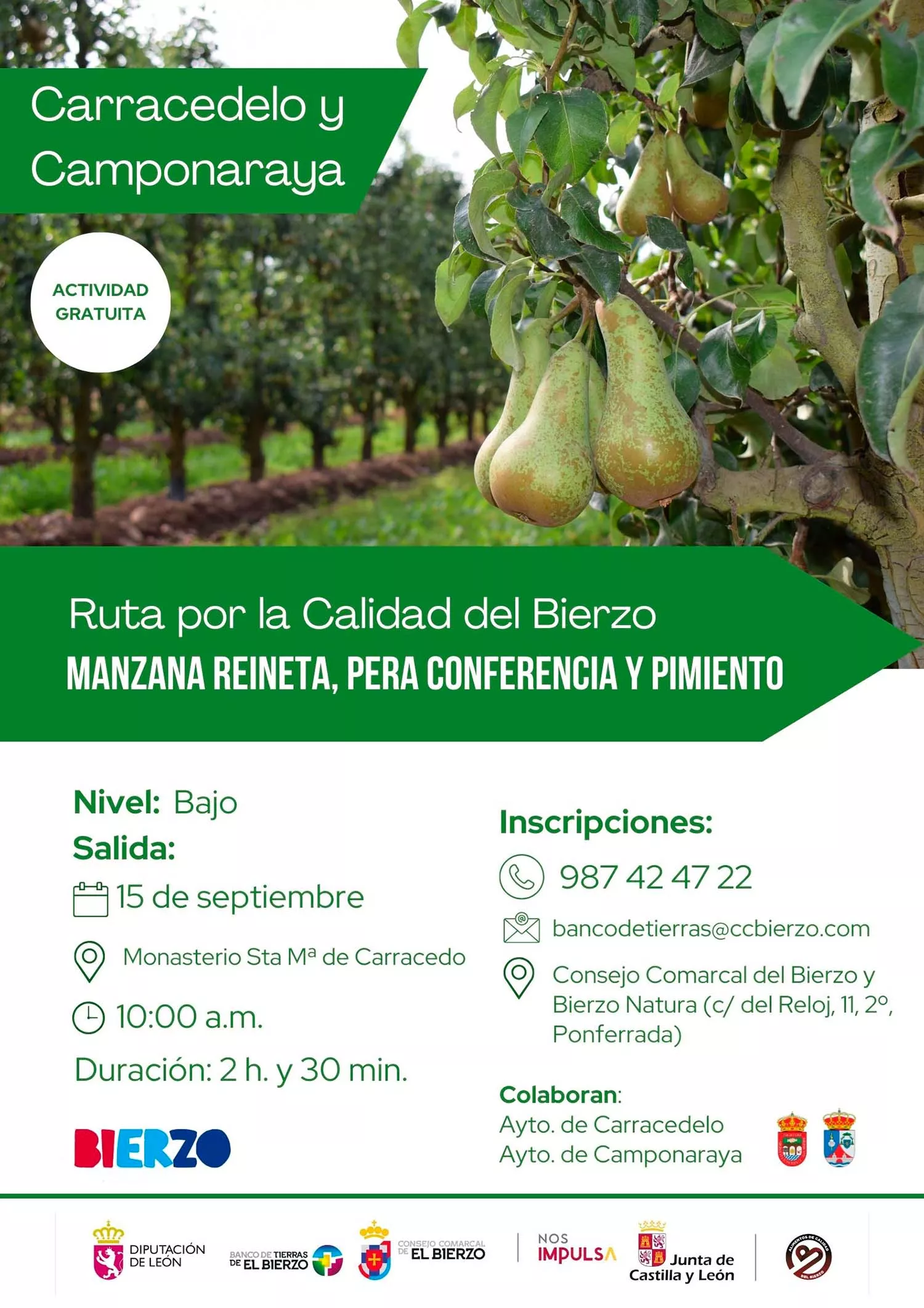 Se abre la inscripción para 'la Ruta por la Calidad del Bierzo' dedicada al pimiento, manzana reineta y pera conferencia celebrada por los municipios de Carracedelo y Camponaraya. Este domingo 15 de septiembre, a partir de las 10:00 horas, se realizará un recorrido circular de 8,5 kilómetros que partirá desde el Monasterio de Santa María de Carracedelo para visitar las plantaciones de los municipios.
