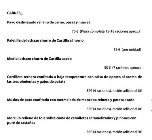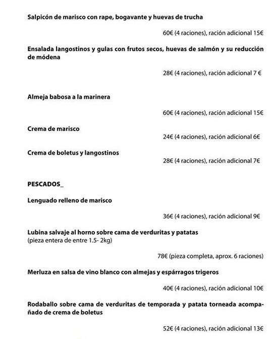 Esta es la carta, los precios incluyen IVA, pueden encargarse piezas sueltas o componer un menú.