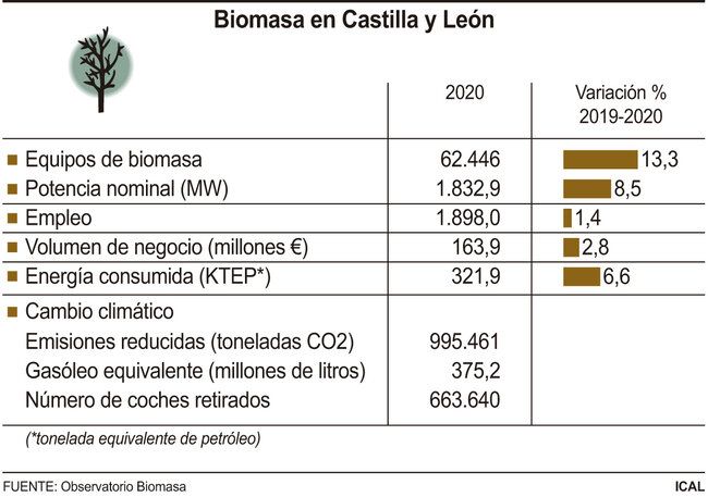 Según la Asociación Española de Valorización Energética de la Biomasa (Avebiom), la producción regional de biomasa evitó el pasado año la necesidad de importar el equivalente a 375 millones de litros de gasóleo de calefacción en Castilla y León y la emisión de casi un millón de toneladas de CO2, el equivalente a lo que consumen 660.000 coches en circulación.