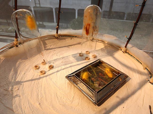 La instalación SEDA contiene un resultado final que es al mismo tiempo el inicio del proceso orgánico en su totalidad. El resultado final son las cúpulas de cristal sobre las que las mariposas han puesto los huevos, y son los huevos el inicio, de ellos nacerán los gusanos de seda. Este proyecto artístico continúa y amplía la instalación artística SEDA [Mística Exactitud] presentada en la Galería de Arte ÁRMAGA (León) con motivo de la entrega del premio Literario Leteo 2022 a Alessandro Baricco, autor de la novela SEDA.