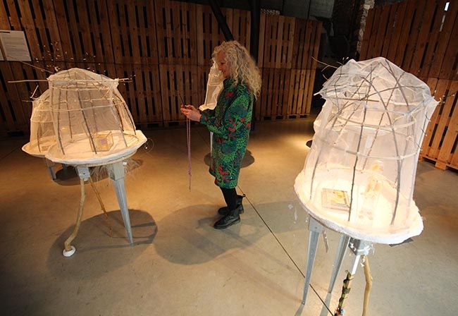 La directora del Museo de la Energía, Yasodhara López, presenta la exposición ‘Seda. Ciencia y arte en movimiento’, acompañada de la concejala de Cultura de Ponferrada, Concepción de Vega, y de la responsable del proyecto artístico, Reme RemediosUn proyecto artístico de Reme Remedios