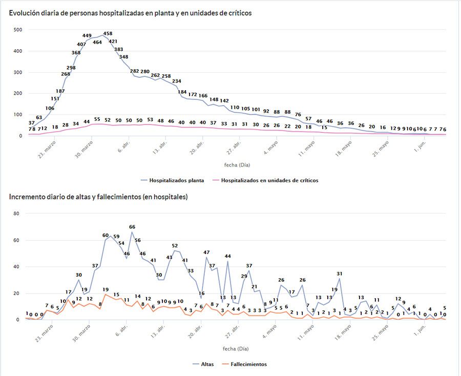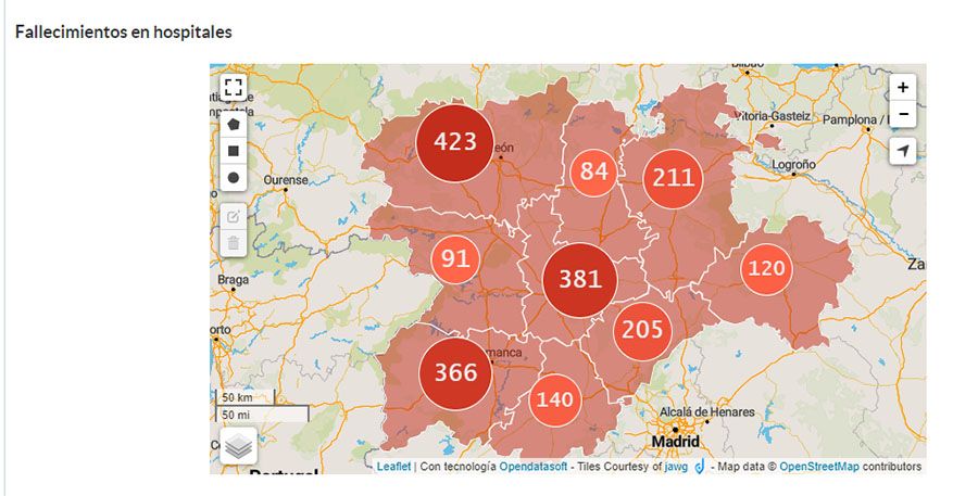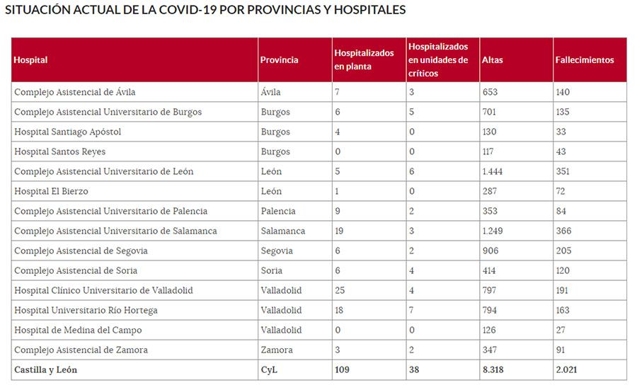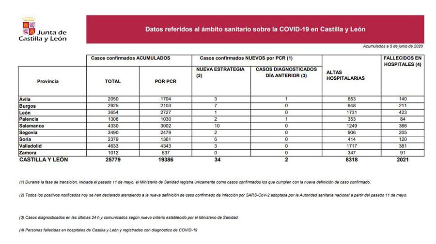 En Castilla y León el total de casos confirmados es de 25.779 (19.386 por PCR), 34 más que el día anterior. En cuanto a altas se han otorgado 8.318 en total y se han registrado 2.021 fallecidos a causa de Coronavirus.