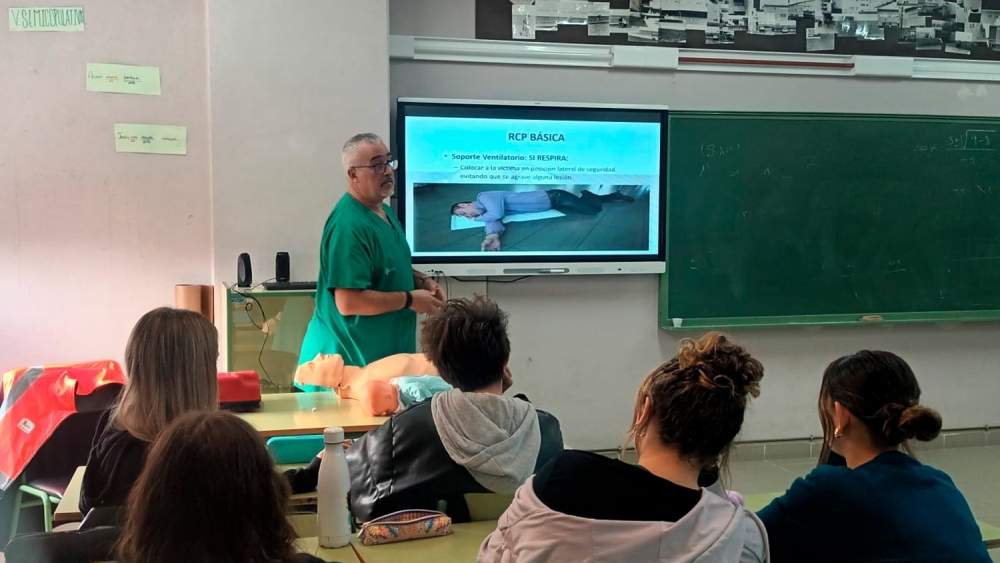 Esta actividad, con una duración de 50 minutos de clase teórica y otros 50 de práctica con muñecos simuladores, concluirá este martes con los estudiantes de cuarto de la ESO del municipio. La educación sanitaria en los centros educativos fomenta que el alumnado conozca cómo actuar ante diversos problemas de salud.