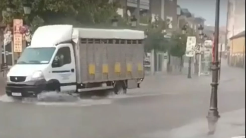 Hace casi un mes el municipio también veía afectada una de sus calles principales por las inundaciones. En esta ocasión ha sido la plaza del Ayuntamiento la que aparecía cubierta por la corriente de agua con varios vehículos salpicando a su paso tras las lluvias de este jueves, que comenzaban durante la tarde.