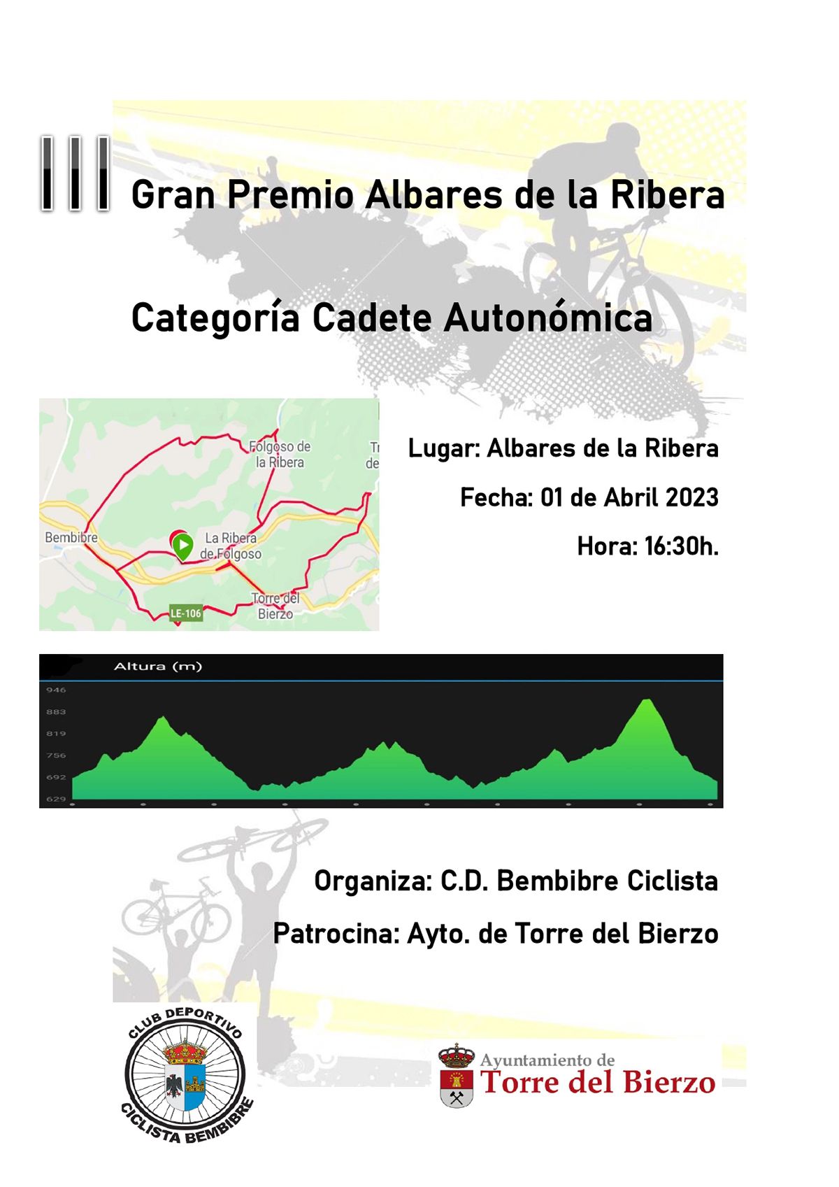 El próximo sábado 1 de abril se celebrará la 3ª edición del Gran Premio Ciclista de Albares de la Ribera, en el Municipio de Torre del Bierzo. Prueba ciclista de categoría cadete masculina. Prueba puntuable para el Trofeo de Castilla y León.