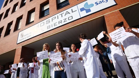 Trabajadores del Hospital de El Bierzo se concentraron a las puertas del centro para reclamar que todos los profesionales cobren por trabajar los sábados como se pagan los domingos y festivos. Denuncian que la Junta de Castilla y León solo pretende abonar estos días a enfermeras y auxiliares y que, aun así, se les pagará un tercio de lo que se cobra por trabajar un domingo o un festivo.