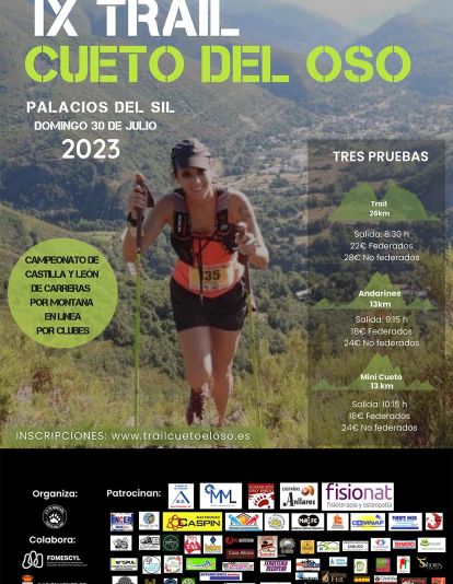 El municipio de Palacios del Sil celebrará el próximo domingo 30 de julio la novena edición del Trail Cueto del Oso, el campeonato de Castilla y León de carreras de montaña en línea por clubes. La prueba consta de tres recorridos diferentes con 400 participantes que constituirán el campeonato. De los concursantes, 200 de ellos se apuntarán para el Trail Cueto el Oso, 100 para la Mini Cueto y 100 para andarines que este año comparten recorrido.
